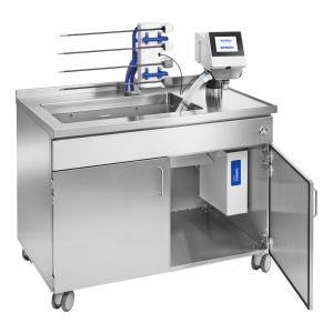 Funktionsschrank für Hochleistungs-Ultraschallbad in Edelstahlschränken mit mobiler Flexibilität in der Vorreinigung.