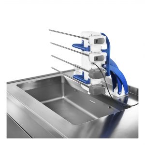 Im TRISON werden die da Vinci Robotik-Instrumente während der Ultraschallreinigung permanent bewegt. Dadurch werden die verschmutzten Arbeitswerkzeuge, Gelenke und auch alle Seilzüge vom Antriebsadapter bis zur Instrumentenspitze effektiv durch Ultraschall gereinigt.