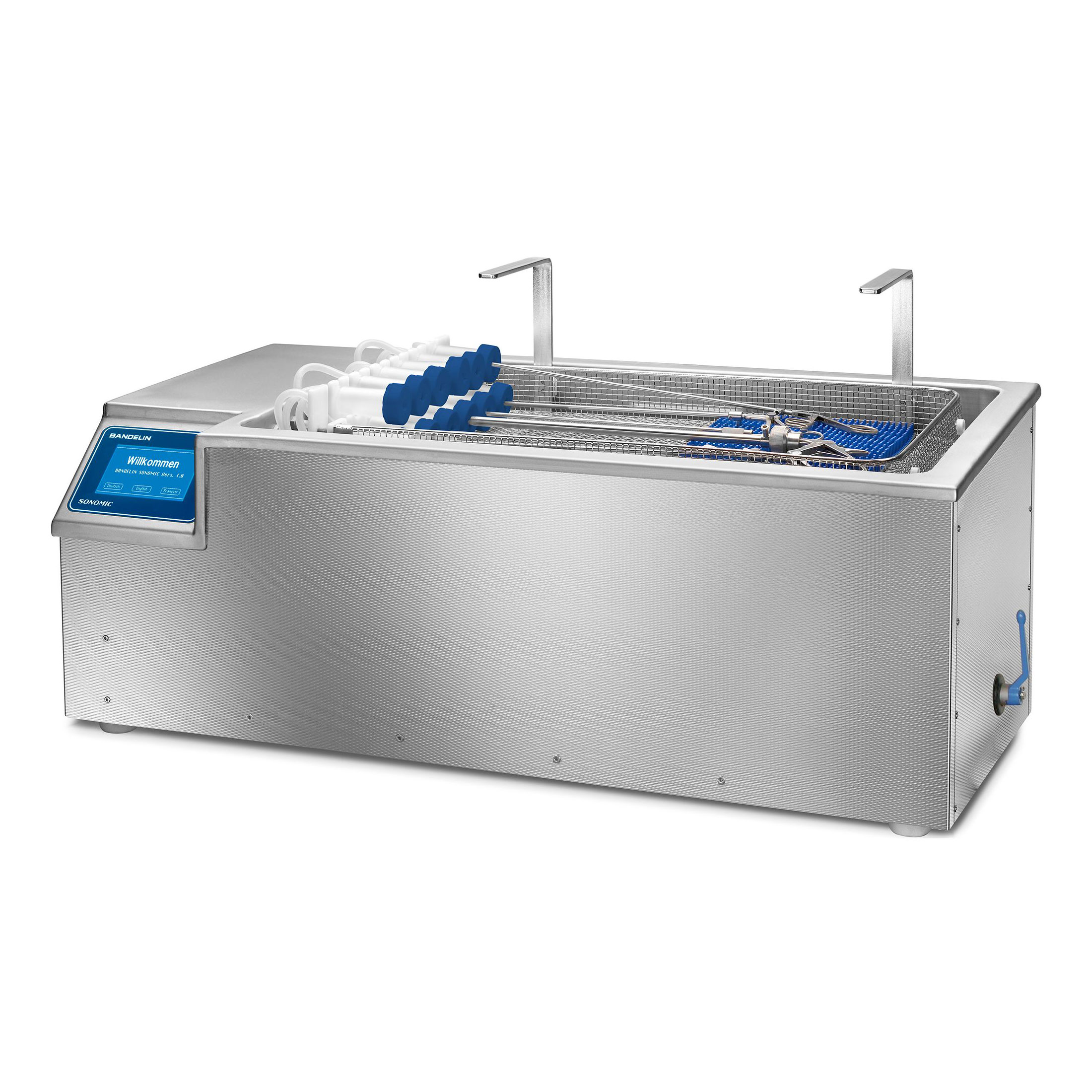 Eine im Programmablauf integrierte Prüfung kontrolliert die Durchgängigkeit jedes einzelnen Instruments. Nicht durchgängige Instrumente werden sicher identifiziert. Zum schnellen Ablassen verbrauchter Badflüssigkeit und zum vollständigen Entleeren des Bades verfügt das SONOMIC über einen geneigten Wannenboden und einen eingeschweißten Ablauf.