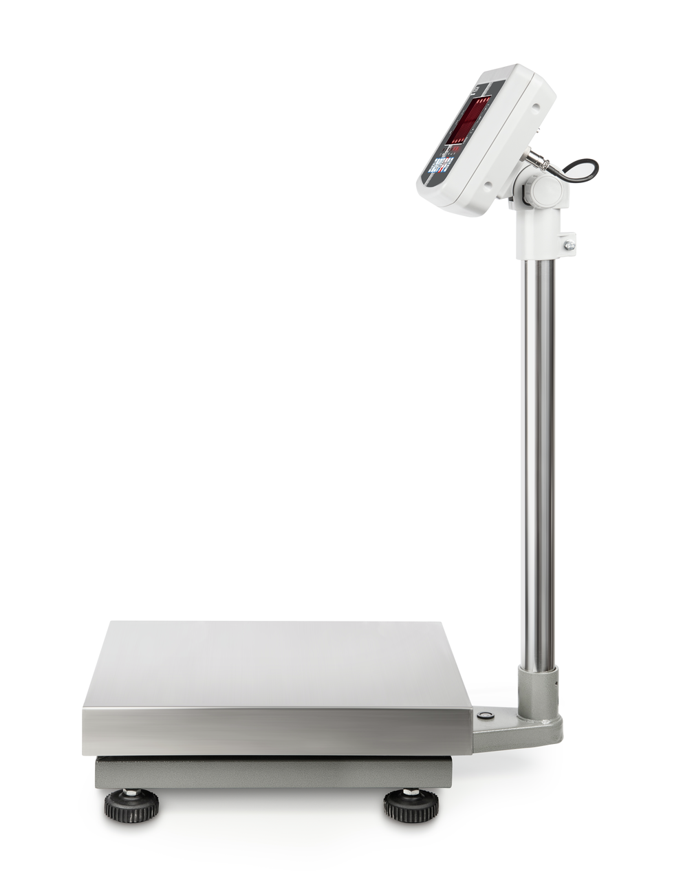 Plattformwaage mit integriertem Akku, einer leuchtstarken LED Anzeige und einem Stativ für optimale Bedienbarkeit