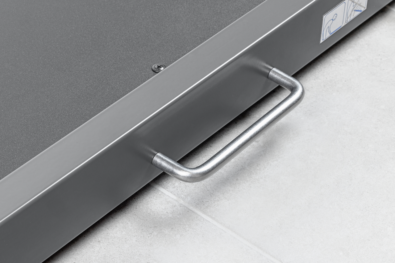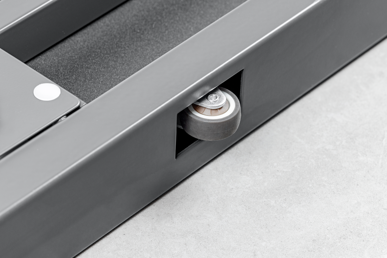 - Waage kann mittels zwei Rollen und einem Handgriff bequem transportiert und platzsparend verstaut werden