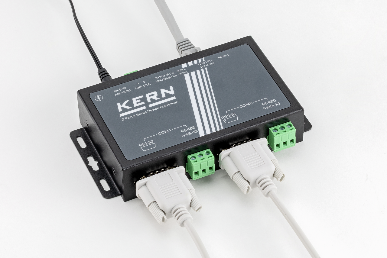 - Lieferumfang: RS-232/Ethernet-Konverter mit 2× RS-232-Ports, Netzadapter (EU). Die beiden RS-232-Ports ermöglichen es, zwei Waagen bzw. Messgeräte parallel anzuschließen und zu verwalten
