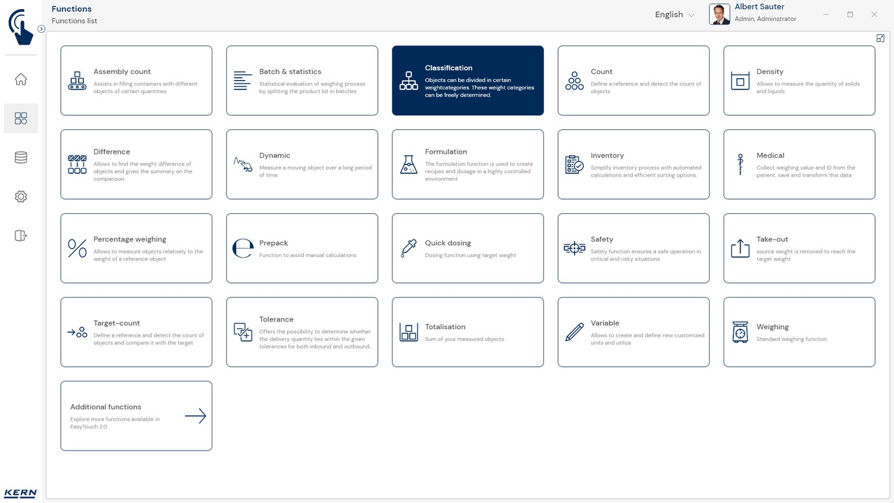 - Die Aufgabe der Klassifizierungsfunktion besteht darin, Wägeobjekte in bestimmte, frei definierbare Gewichtsklassen einzuordnen. So ermöglicht sie eine einfache und komfortable Sortierung der Objekte und macht das Ablesen und Interpretieren der Wiegeergebnisse durch den Benutzer überflüssig