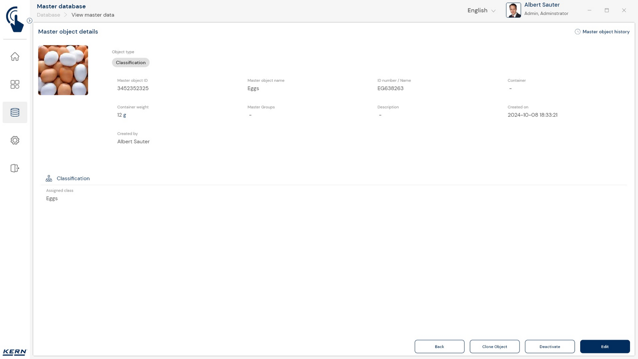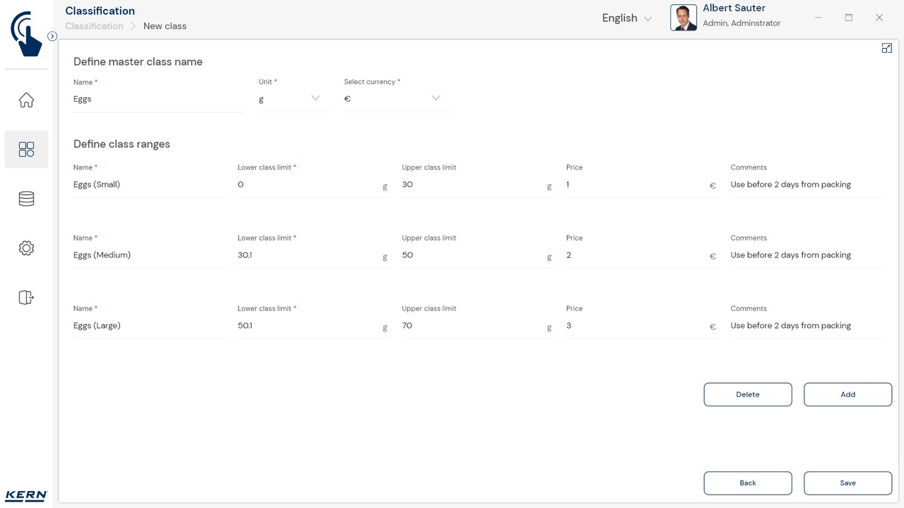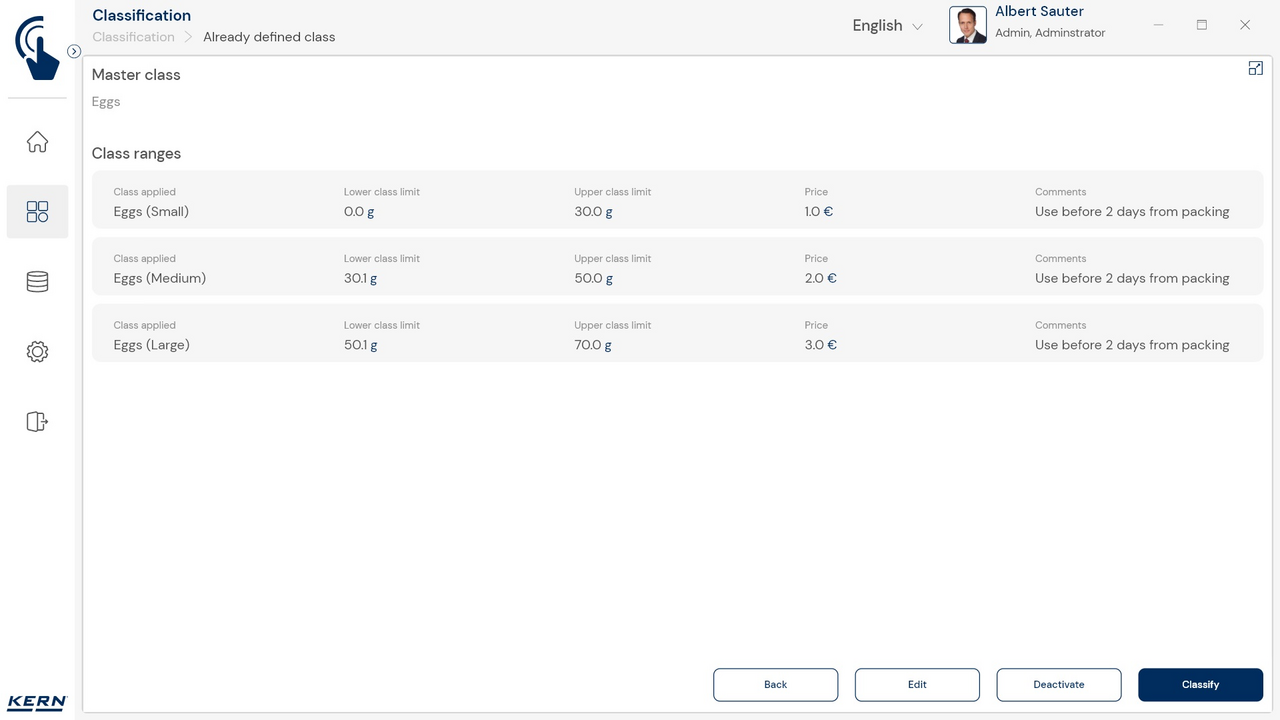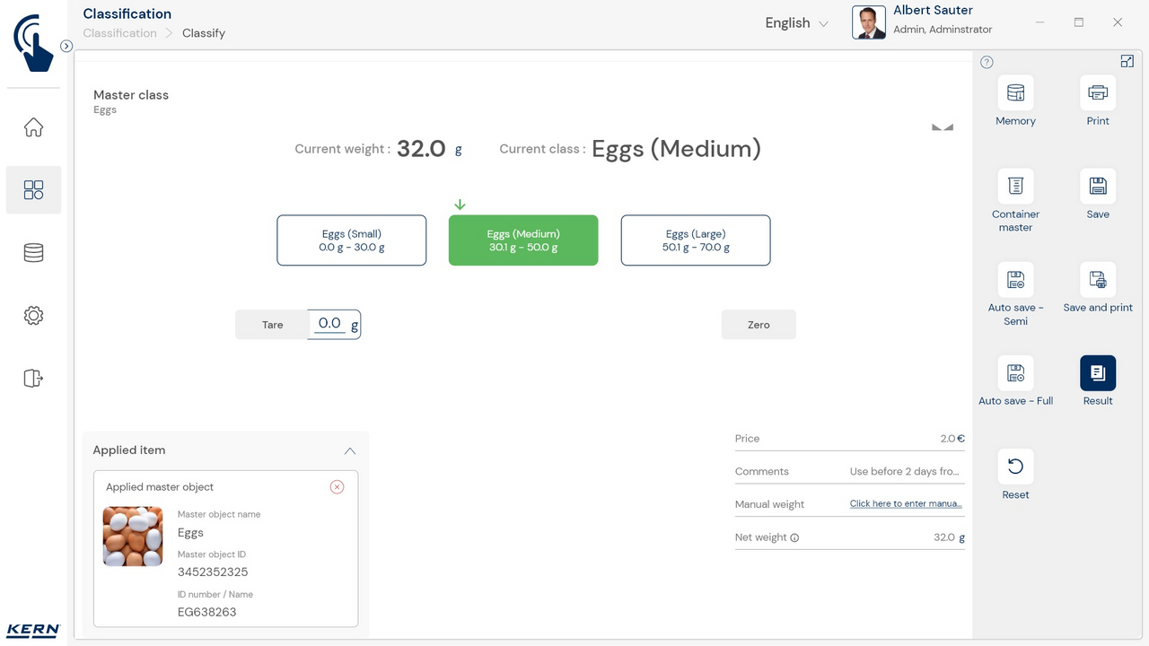 - Zentraler Stammdatenspeicher: Klassifikationsobjekte können im Systemspeicher mit Klassifikationsprofil, Klassennamen, jeweils unterem und oberen Grenzwert, ggf. Preis und Kommentar pro Klasse, sowie ID-Nummer und ID-Bezeichnung, Bild etc. gespeichert werden. Dadurch müssen diese Werte nicht immer wieder neu eingegeben werden, sondern können bequem aus dem Speicher abgerufen werden. Im Stammdatenspeicher kann auch ein möglicher Tara-Wert der typischen Verpackung, Box oder des Containers hinterlegt werden, der dann automatisch vom Wiegeergebnis abgezogen wird (PreTare)