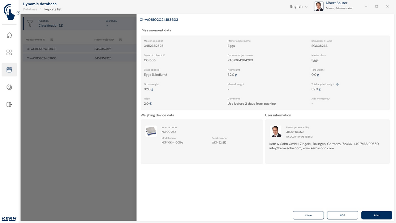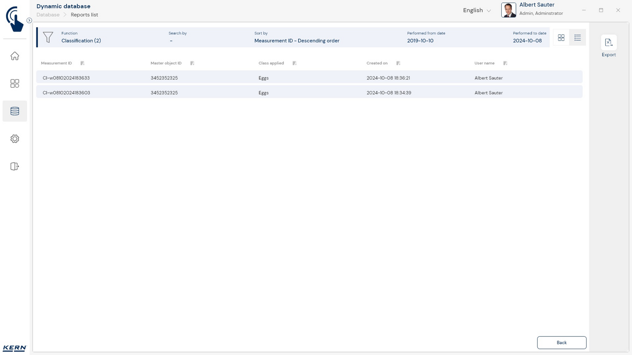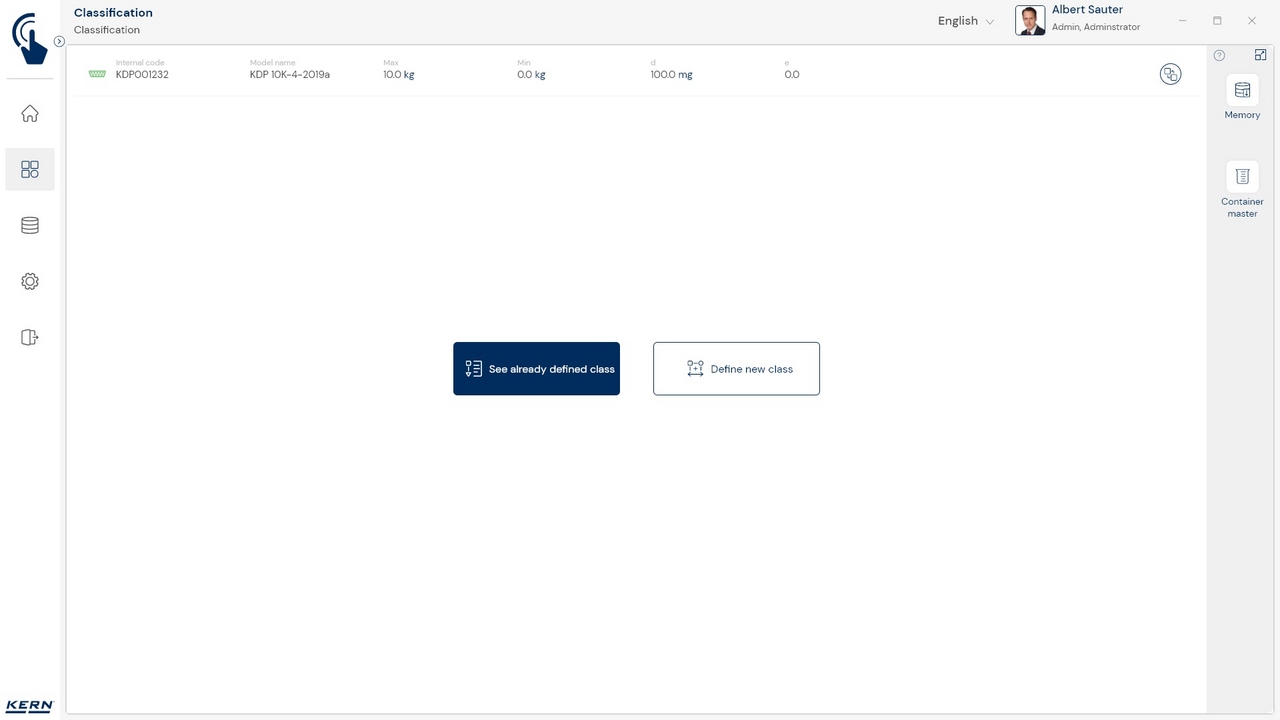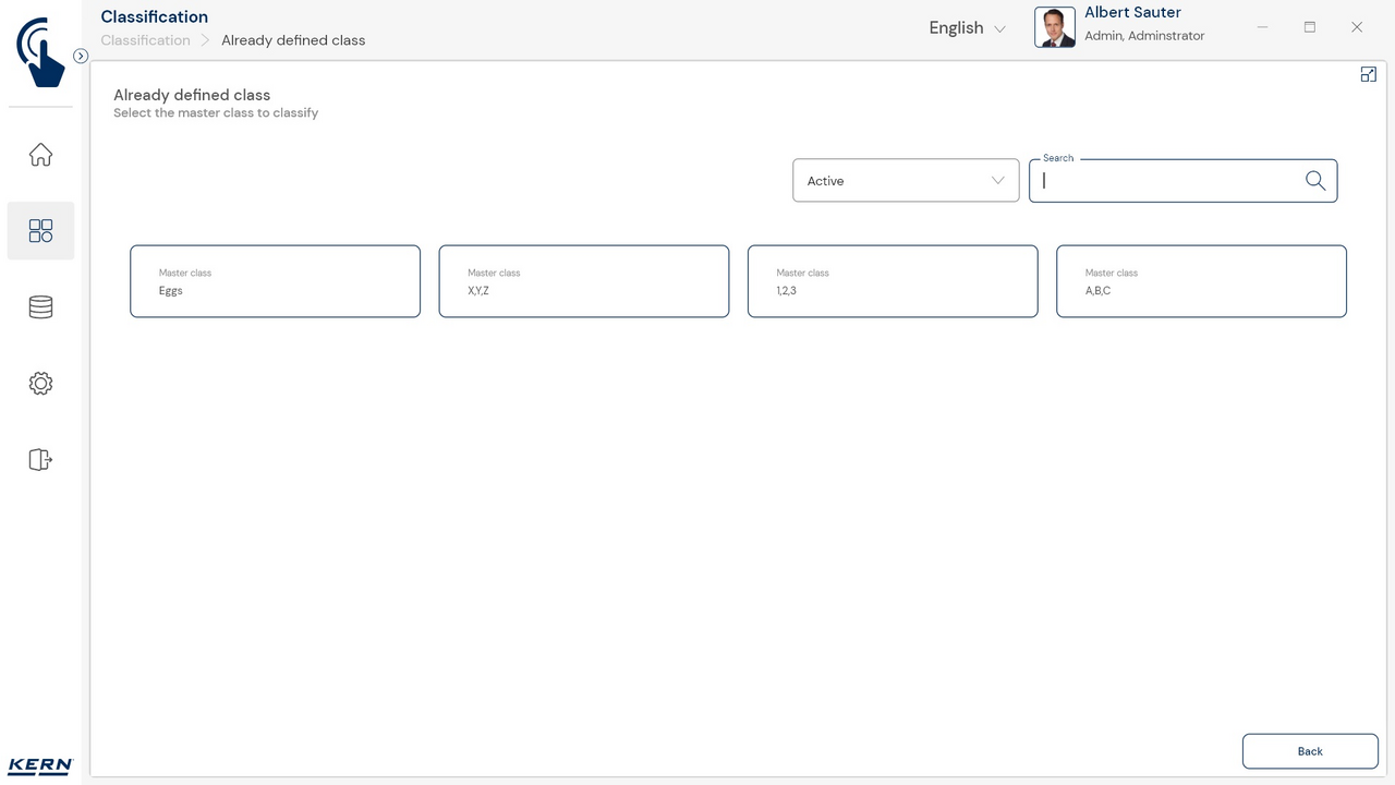 - Zentraler Stammdatenspeicher: Klassifikationsobjekte können im Systemspeicher mit Klassifikationsprofil, Klassennamen, jeweils unterem und oberen Grenzwert, ggf. Preis und Kommentar pro Klasse, sowie ID-Nummer und ID-Bezeichnung, Bild etc. gespeichert werden. Dadurch müssen diese Werte nicht immer wieder neu eingegeben werden, sondern können bequem aus dem Speicher abgerufen werden. Im Stammdatenspeicher kann auch ein möglicher Tara-Wert der typischen Verpackung, Box oder des Containers hinterlegt werden, der dann automatisch vom Wiegeergebnis abgezogen wird (PreTare)