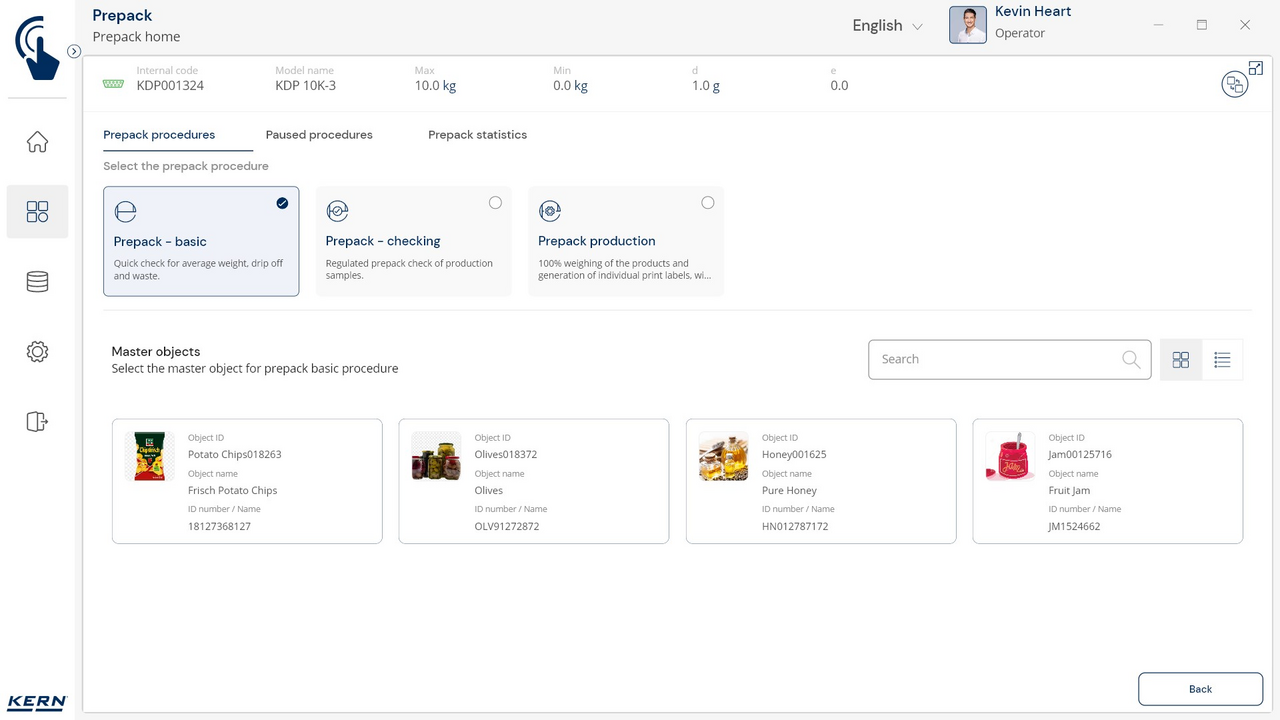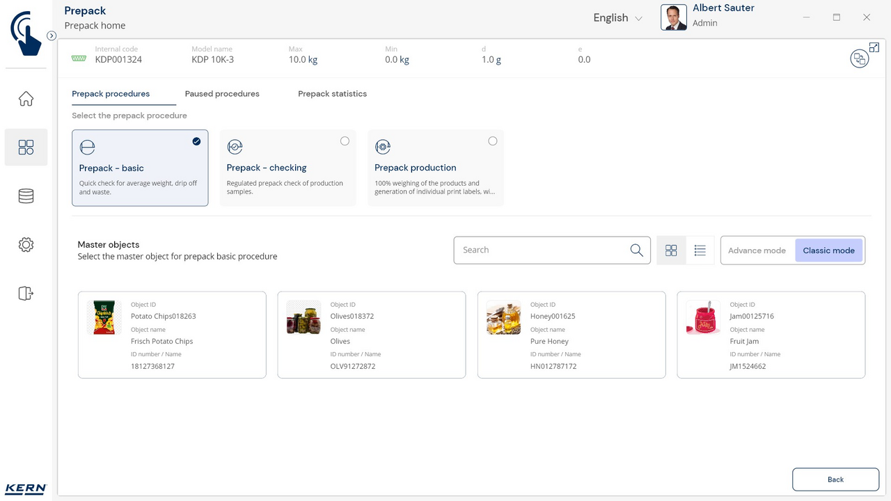 - Konformitätsbewertete Waagen: Wie alle anderen EasyTouch-Funktionen auch, kann PrePack mit geeichten KERN-Waagen (Konformitätsbewertung nach NAWI, 2014/31/EU) mit eingebautem Alibispeicher betrieben werden. Die Alibi-Speicher-ID der Waage wird an die Software übergeben und mit den Messdaten objektbezogen und manipulationssicher gespeichert. Anhand dieser Messwert-bezogenen Alibi-ID in der Software kann im Bedarfsfall der geeichte Wiegewert im Speicher der Waage eindeutig rückverfolgt und nachgewiesen werden