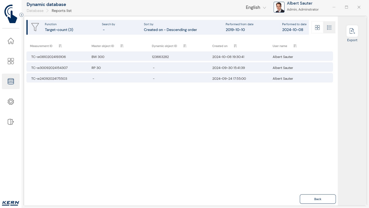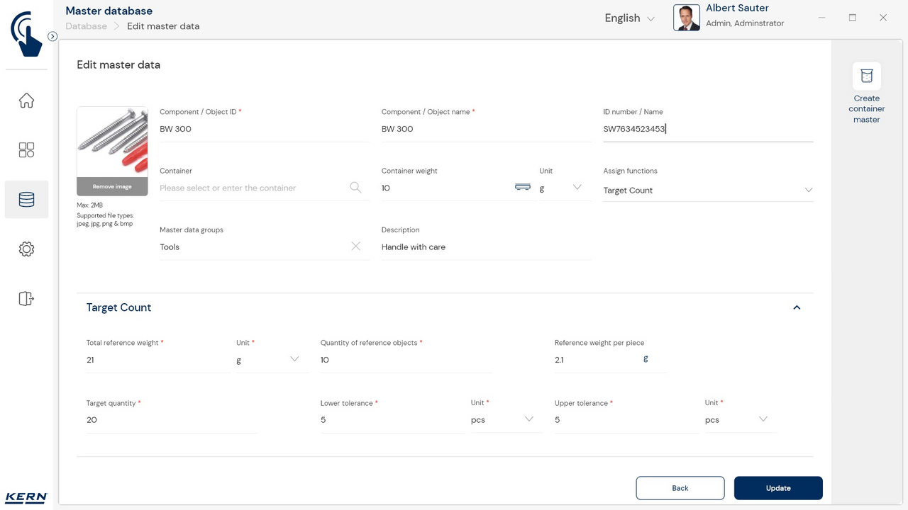 - Zentraler Stammdatenspeicher: Zusätzlich zu den Stammdaten aus der Stückzählfunktion (SET-32) kann hier auch der Zielwert für das Stückzählen, der untere und obere Grenzwert sowie der Tara-Wert des Containers hinterlegt und wieder aufgerufen werden. Dies ermöglicht einen hocheffizienten Arbeitsfluss (SET-32)