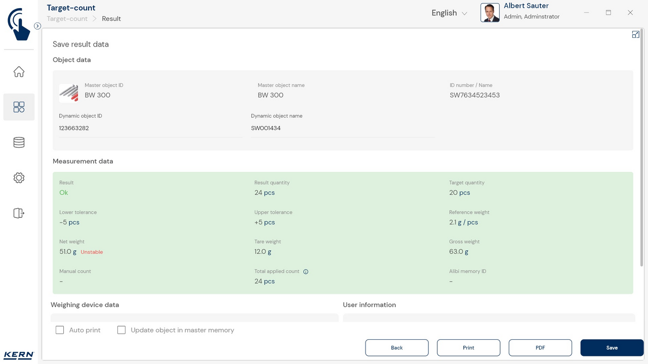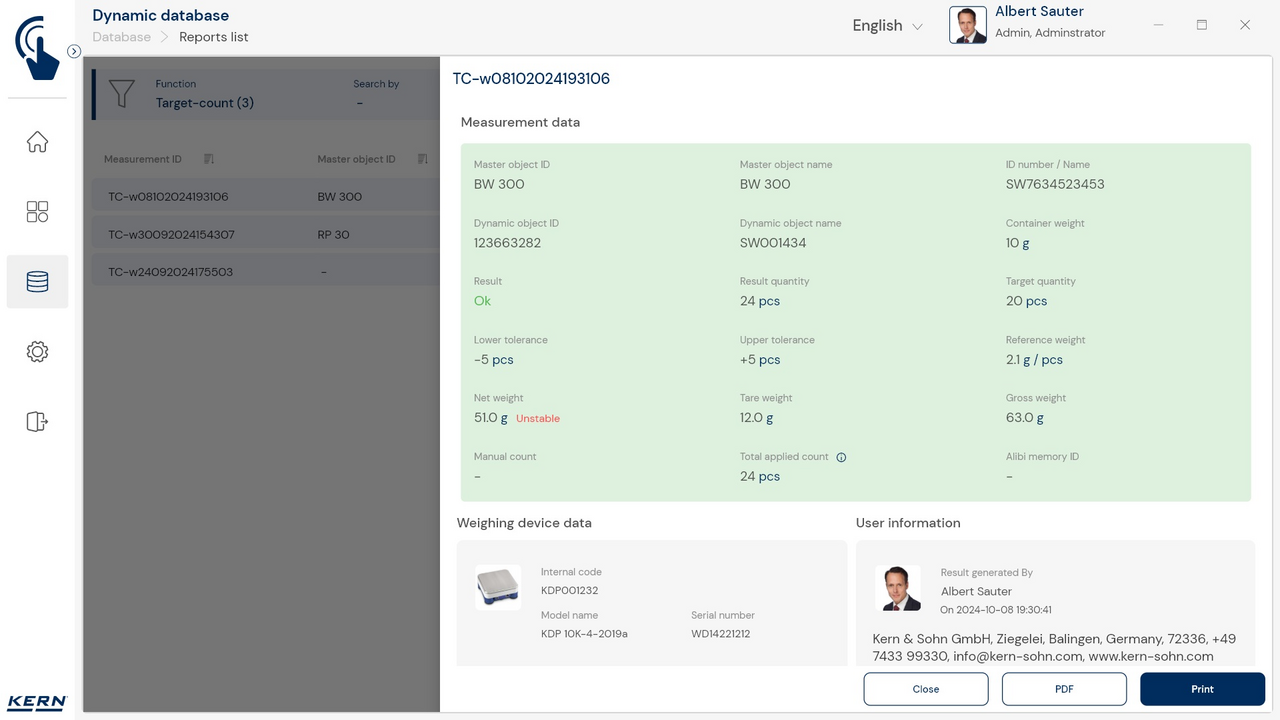 - PC-Druckfunktion und Barcode-Scanfunktion: Durch den Betrieb von KERN EasyTouch in einer Windows®- oder einer Android™-Umgebung kann die volle PC/Tablet-Zubehörinfrastruktur genutzt werden. Insbesondere Standard-Windowsdrucker und PC-Etikettendrucker können umfangreiche Zählscheine oder kompakte Klebe-Labels mit dem Zählergebnis nach individueller Festlegung ausdrucken