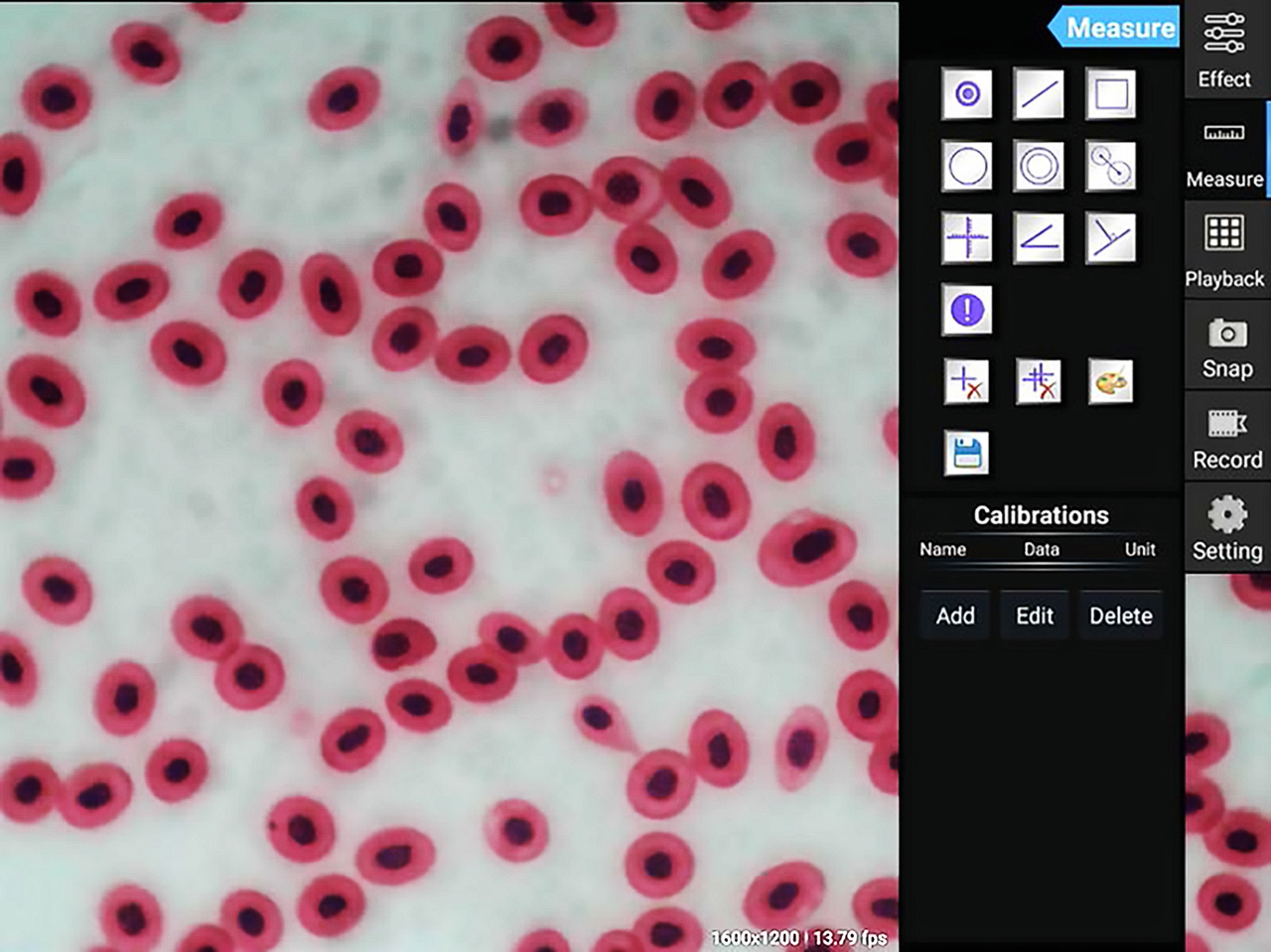 - Die integrierte 5-MP-Kamera ermöglicht neben der Live-Übertragung des Bildes an das Android Tablet auch die Erstellung von Bildern und Videos zur Dokumentation. Einfache Messungen, wie z. B. Strecken-, Flächen- und Winkelmessungen sowie eine manuelle Zählfunktion sind ebenfalls vorhanden