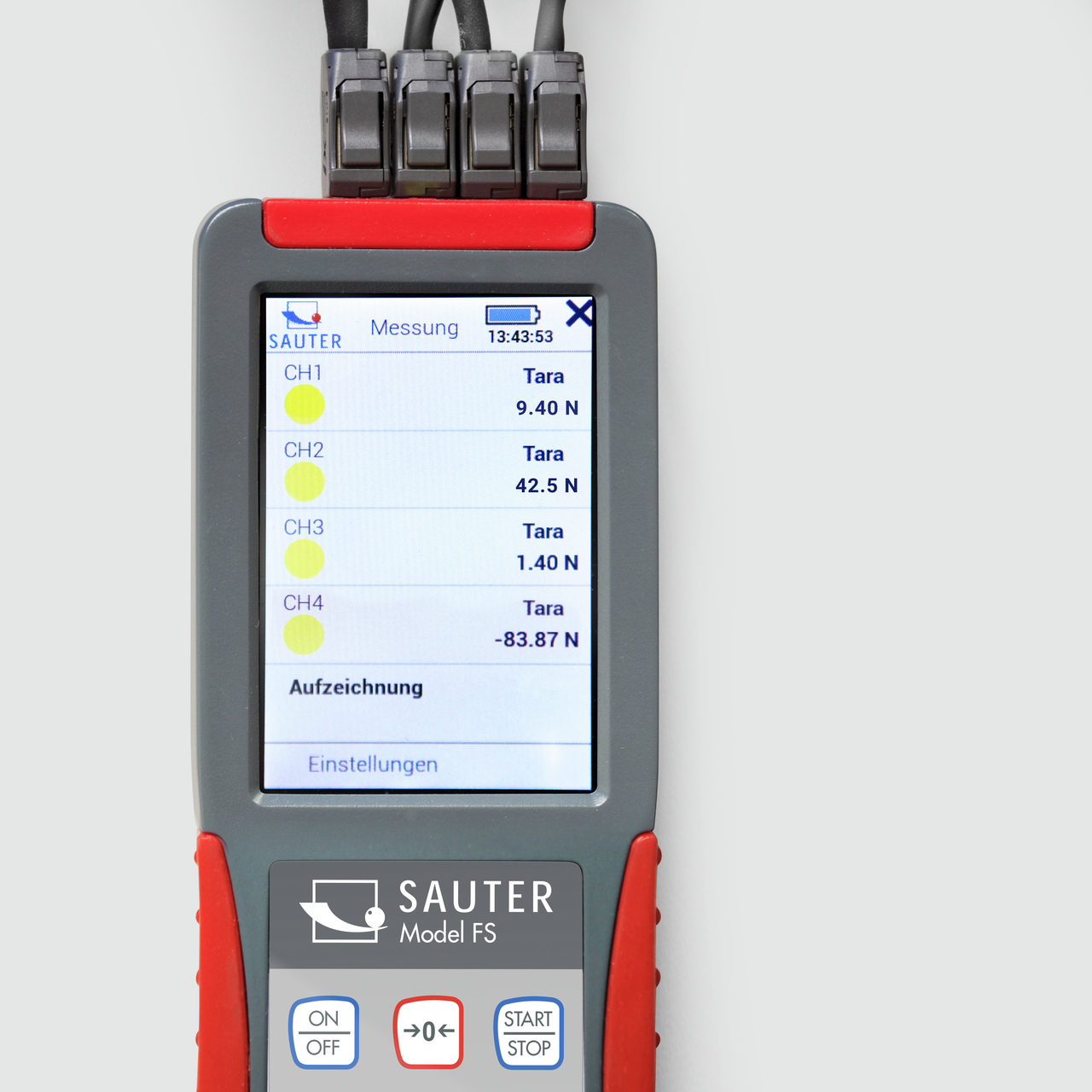 Das Premium Kraftmessgerät SAUTER FS ist mit allen SAUTER Dehnungsmessstreifen-Messzellen kompatibel, siehe Messzellen. Es können bis zu 4 externe Messzellen gleichzeitig angeschlossen werden. Bei Nutzung aller verfügbarer, externer Messkanäle wird die interne Messzelle so lange deaktiviert, wie eine externe Messzelle angeschlossen ist. - Messen von Kräften in verschiedenen Zug- oder Druckrichtungen mit nur einem Messgerät möglich