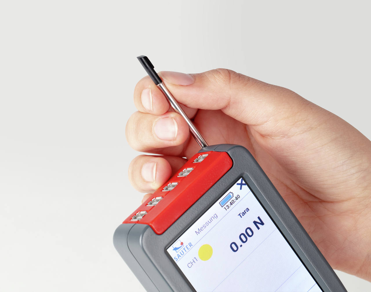 Das Premium Kraftmessgerät SAUTER FS ist mit allen SAUTER Dehnungsmessstreifen-Messzellen kompatibel, siehe Messzellen. Es können bis zu 4 externe Messzellen gleichzeitig angeschlossen werden. Bei Nutzung aller verfügbarer, externer Messkanäle wird die interne Messzelle so lange deaktiviert, wie eine externe Messzelle angeschlossen ist. - Messen von Kräften in verschiedenen Zug- oder Druckrichtungen mit nur einem Messgerät möglich