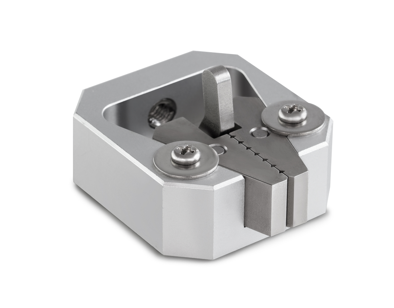- Einfache Handhabung ohne Werkzeug, Prüfling kann einfach in die geöffnete Klemme eingelegt werden. Diese zieht sich bei einem Zugversuch selbstständig zu