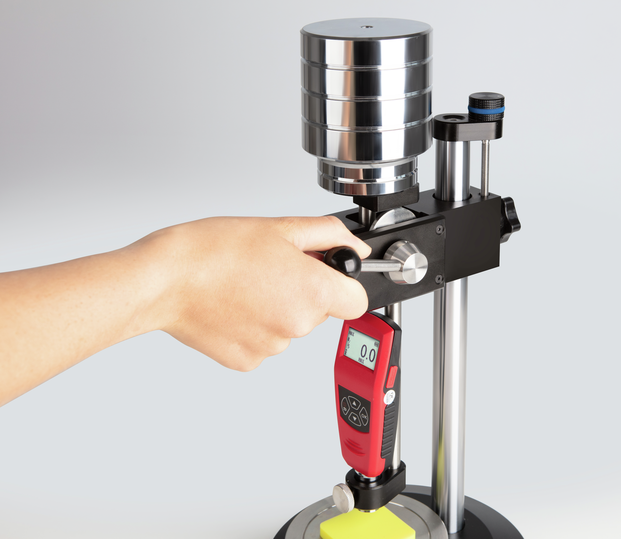 4. Durch Herabdrücken des Hebels wird das Prüfgewicht freigegeben, welches dann mit seinem Gewicht die Messspitze in das Prüfobjekt eindrückt - Härtemessgerät nicht im Lieferumfang enthalten